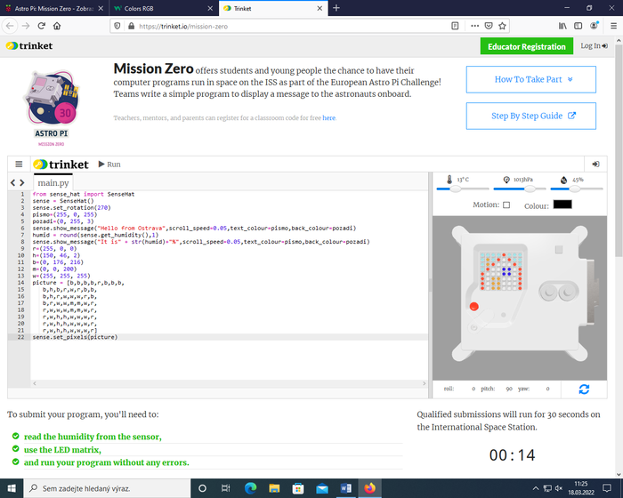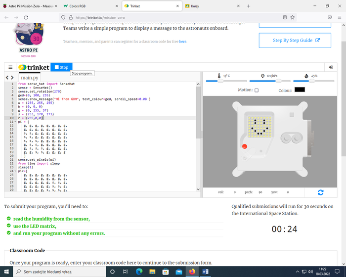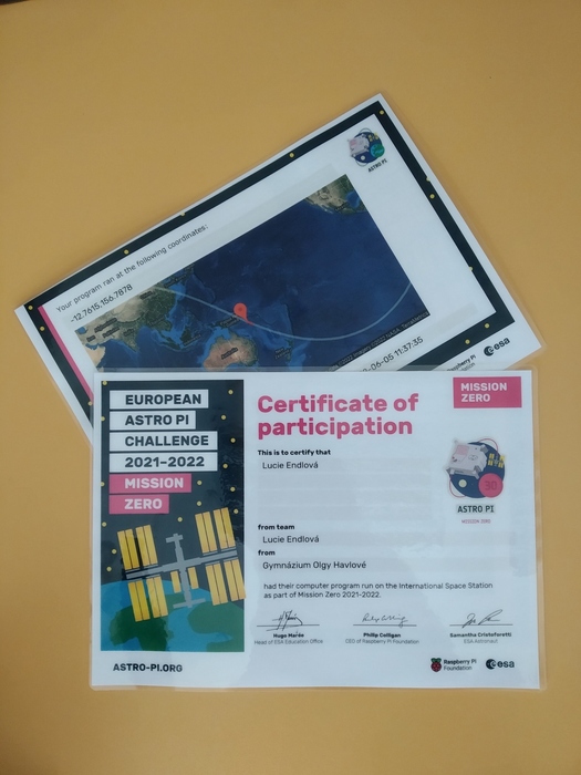 V březnu letošního roku se část studentů třídy 3.B zúčastnila projektu evropské kosmické agentury ESA pod názvem Mission Zero. Studenti měli za úkol sestavit program, kterým vytvoří a zobrazí krátkou zprávu pro astronauty na Mezinárodní vesmírné stanici ISS. Zpráva měla obsahovat krátký vzkaz a informaci o vlhkosti vzduchu na palubě. Při vytváření programu studenti používali online emulátor Sense HAT. Výsledné zprávy, které splnily zadaná kritéria, pak byly vysílány na vesmírné stanici a studenti obdrželi certifikáty s údaji, kdy byla jejich zpráva vysílána a kde se vesmírná stanice při vysílání nacházela. Celkem se projektu zúčastnilo 16869 týmů z 26 zemí.