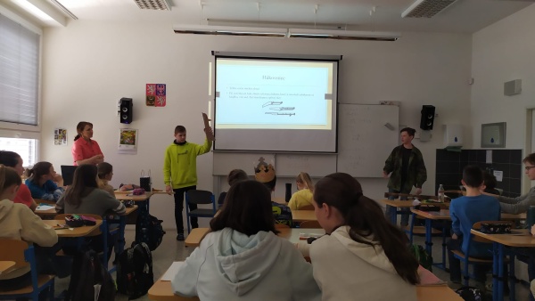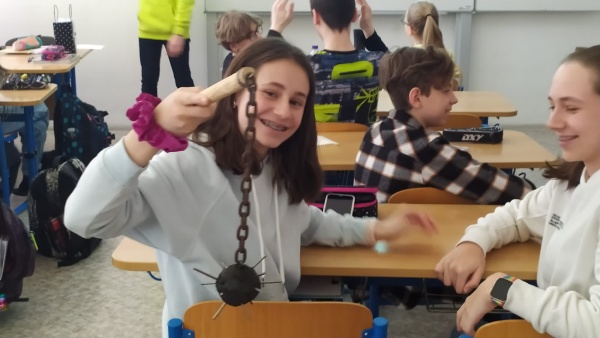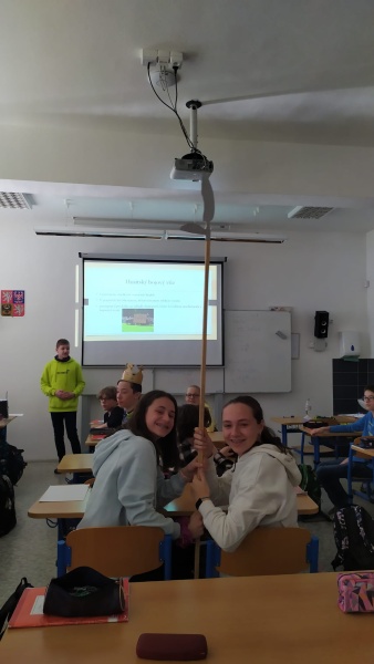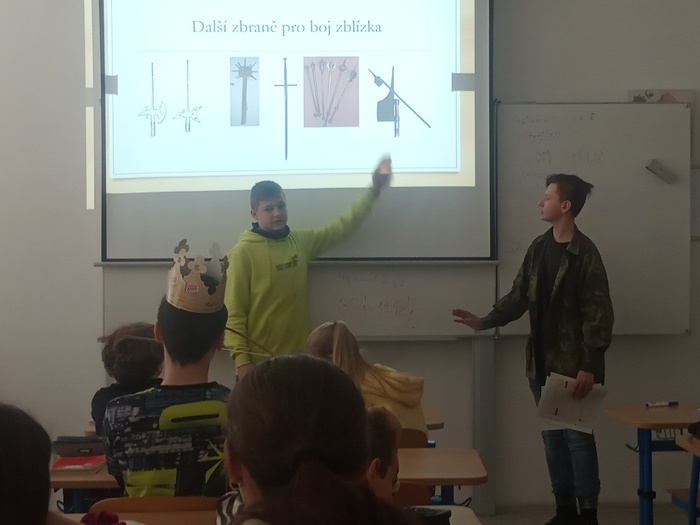 Abych dala příležitost všem zájemcům, rozhodla jsem se, že žákům nabídnu "soutěž o nejlepší prezentaci". Soutěžily tři dvojice a nutno dodat, že všechny byly velmi připravené. Třídní publikum rozhodlo o vítězné dvojici, Ondrovi Juchelkovi a Matěji Pokludovi, kteří si kromě výkladu přinesli také vlastnoručně vyrobené napodobeniny.